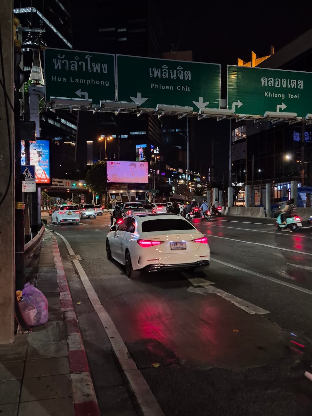 Stad en structuur in beeld. Nachtelijk verkeer vloeit samen met het heldere lijnenspel van Bangkokse architectuur.