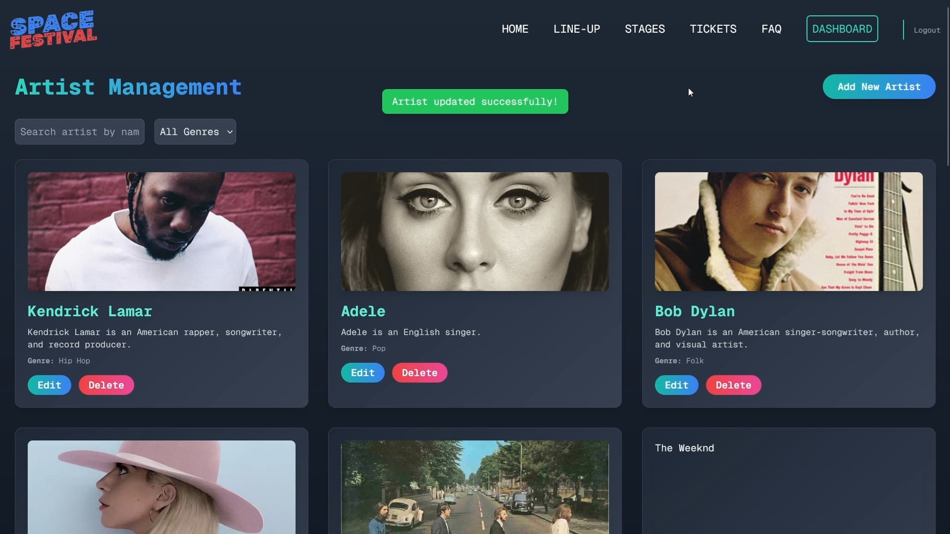 Admins kunnen podia, artiesten, dagen en tickets beheren via een aparte adminomgeving binnen de Angular applicatie.
