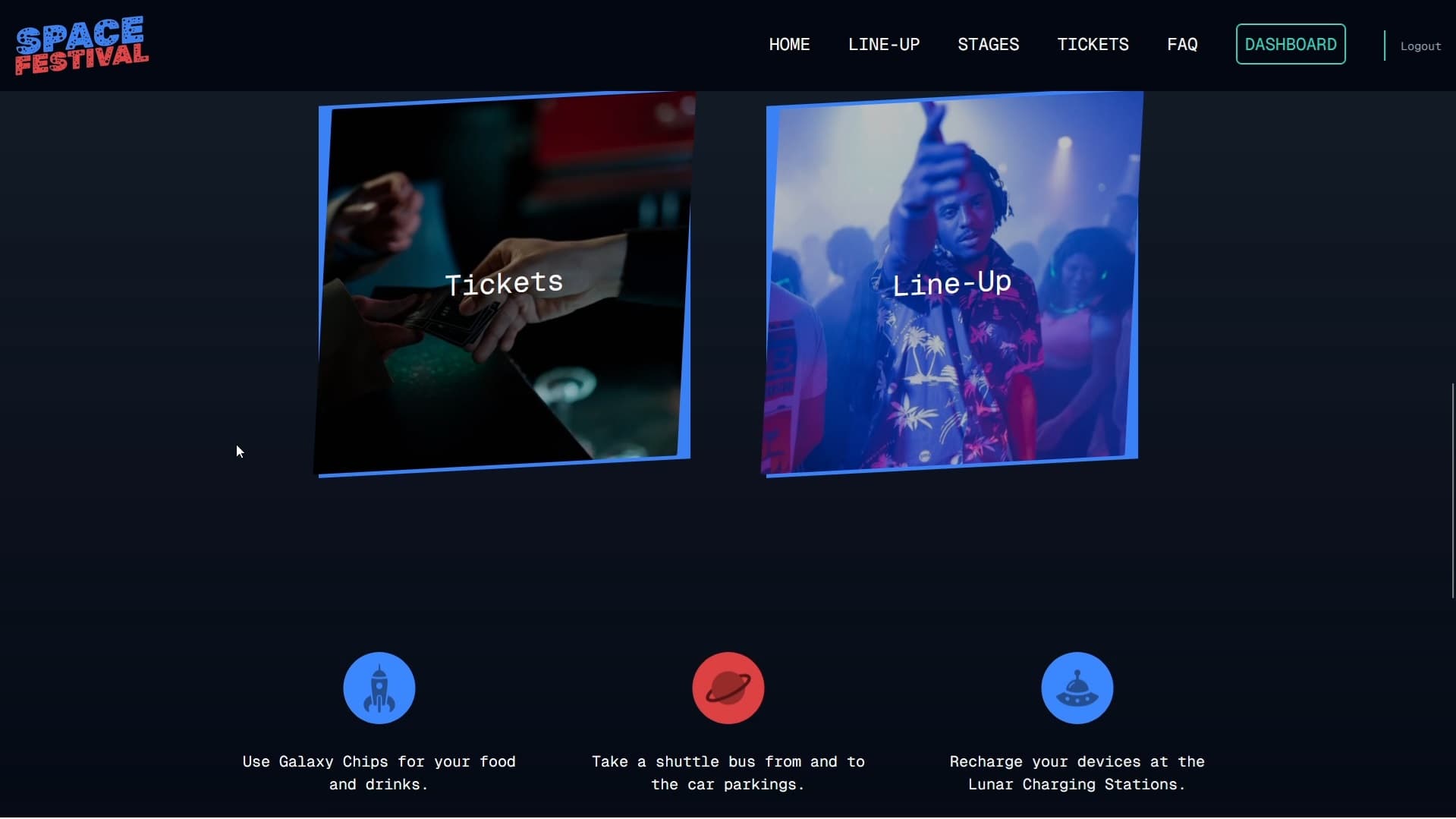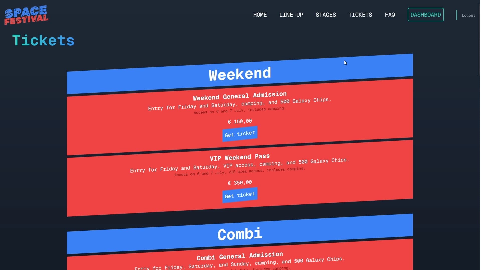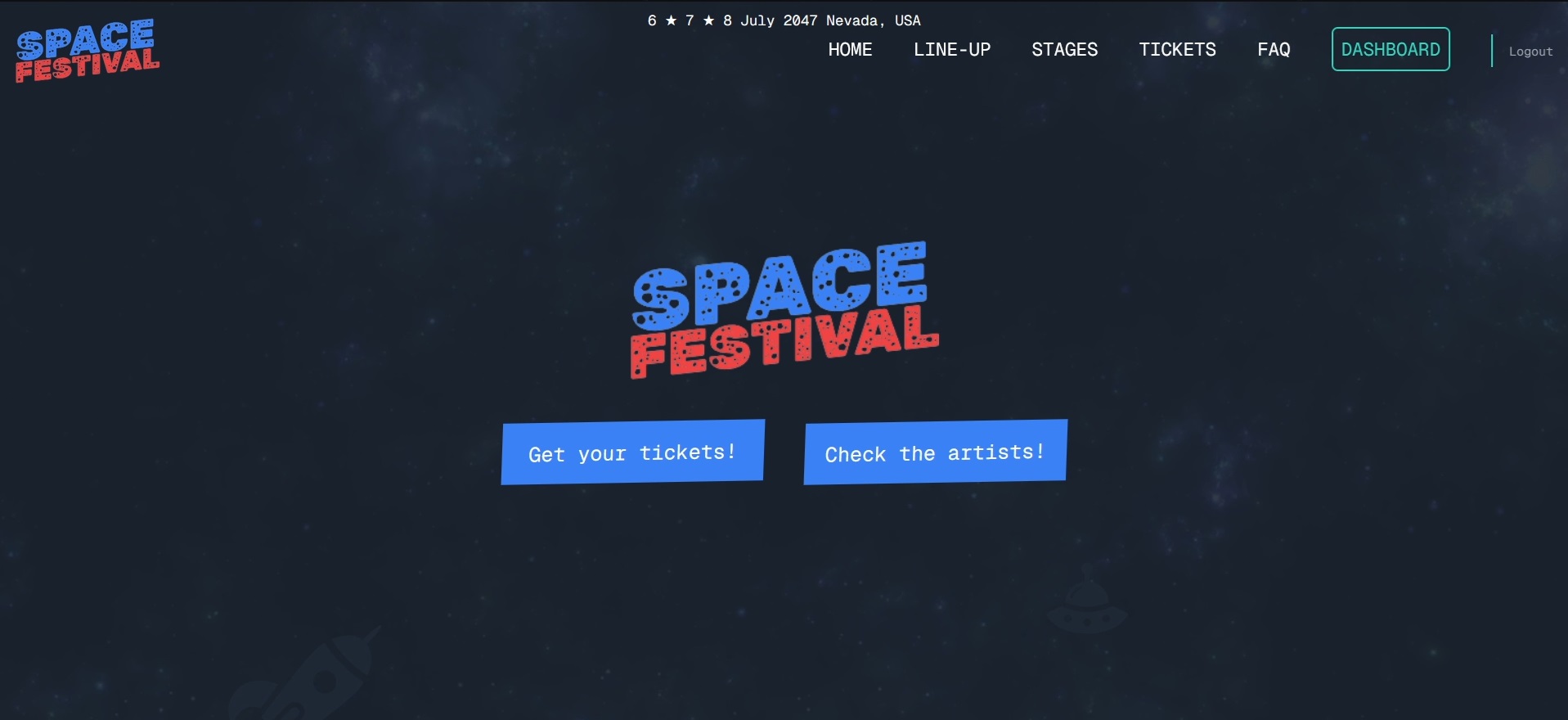 Space Festival is een fictieve festivalapplicatie die werd gebouwd met Angular. Het space-thema vormde de rode draad, met een uitgebreid systeem voor ticketverkoop, lineup-weergave en adminbeheer.