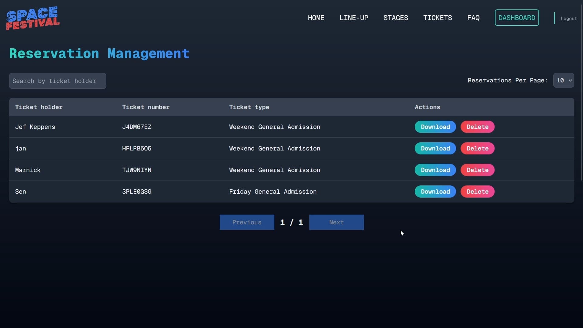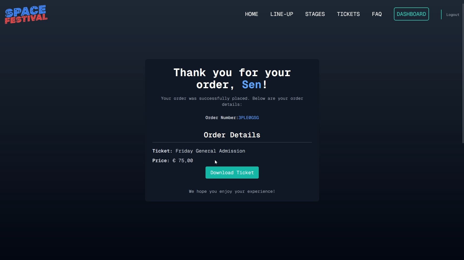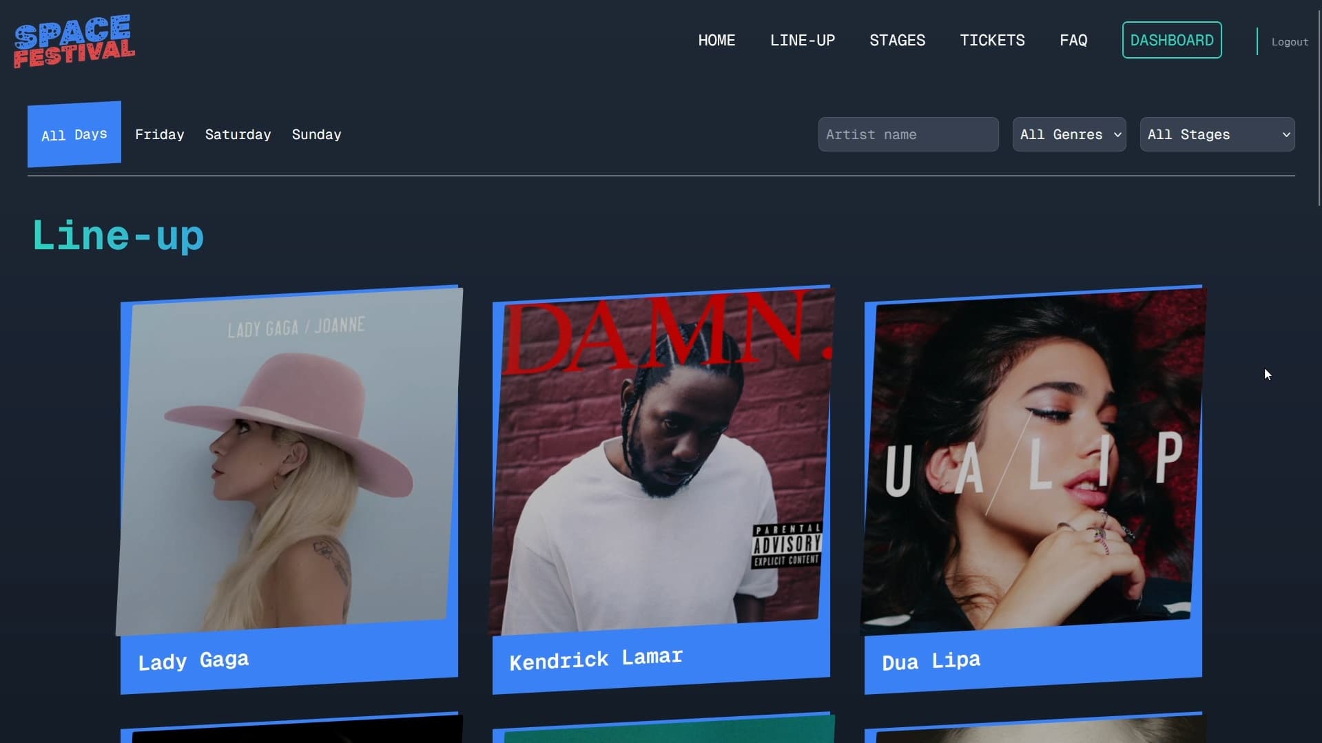 Space Festival is een fictieve festivalapplicatie die werd gebouwd met Angular. Het space-thema vormde de rode draad, met een uitgebreid systeem voor ticketverkoop, lineup-weergave en adminbeheer.